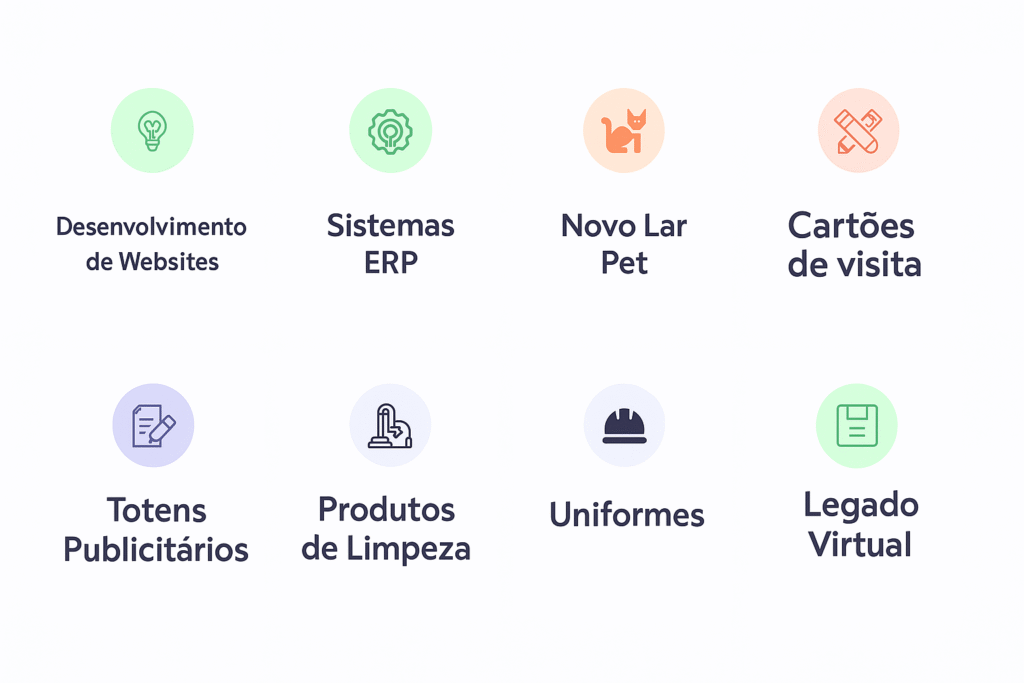 Sistemas ERP completos para empresas de todos os portes, com notas fiscais, ordens de serviço, controle de estoque e relatórios detalhados.